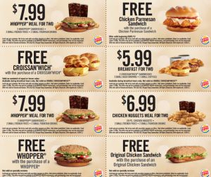 Burger King Coupons April 2024 by adminPosted onApril 9, 2024 Burger King Coupons April 2024 April is here and now its time to use the latest coupons. Use the coupon codes we sent out via email this week and the coupons listed below to maximize your savings. Save on family bundles, burgers and chicken.