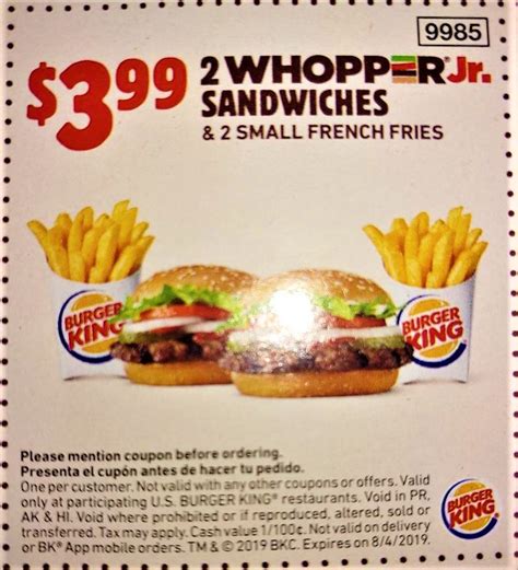 Below you can find and download the latest coupon codes printed on the corners of the burger king coupons. Cut each coupon out and use them at your local drive through or in store.
